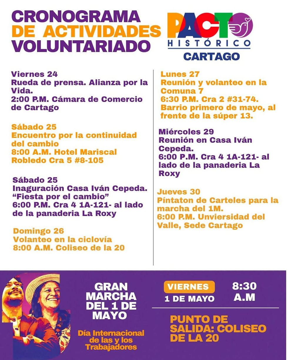 La ocasión sirvió para aclarar dudas sobre el funcionamiento de la campaña al señalar que hay cuatro comités y tres sedes en el municipio de Cartago, también se explicó las razones de seguridad que llevaron a cancelar la visita del candidato presidencial, Iván Cepeda que tenía programada para el 3 de mayo en el Parque de Bolívar.
